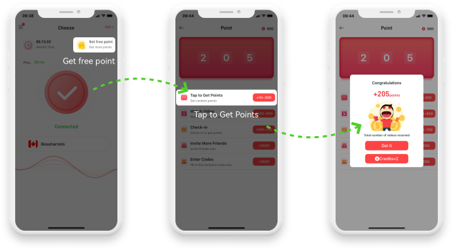 Click Tap to Get Points to get 10 to 300 points randomly, and click Tap to Get Points for unlimited times. You can choose to watch ads to get double points. If you click Tap to Get Points to get 220 points, after watching the video, you will get 440 points.
