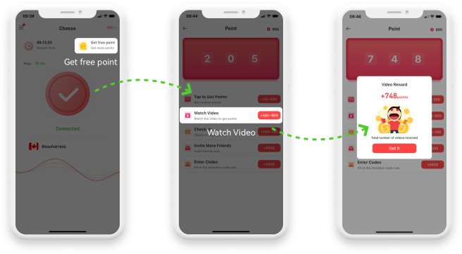 After the 900 points experience, you can earn points by watching advertisements. By saving points to redeem the nodes in the country you want to connect to, you can enjoy an ad-free, log-free, stable and fast internet speed experience.