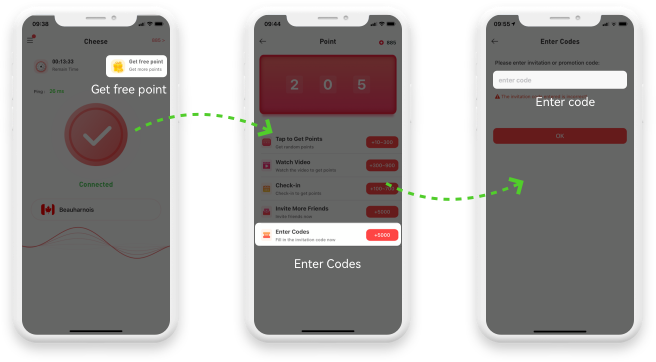 Share CHEESE VPN with your friends, ask your friends to download CHEESE VPN, enter your invitation code, you will get 9000 points